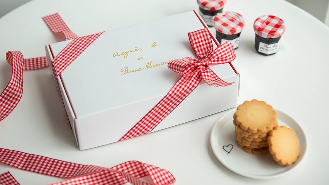 アニエスベーオリジナルサブレとBonne Mamanの3種のジャム(ストロベリー、ブルーベリー、ラズベリー)を詰め合わせたギフトボックス。ホリデーシーズンにぴったり。