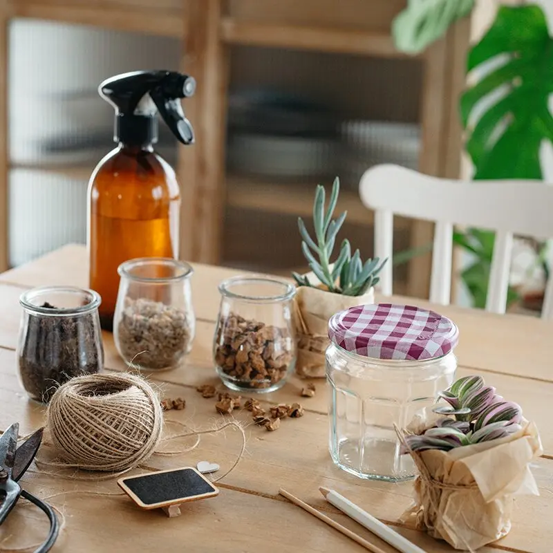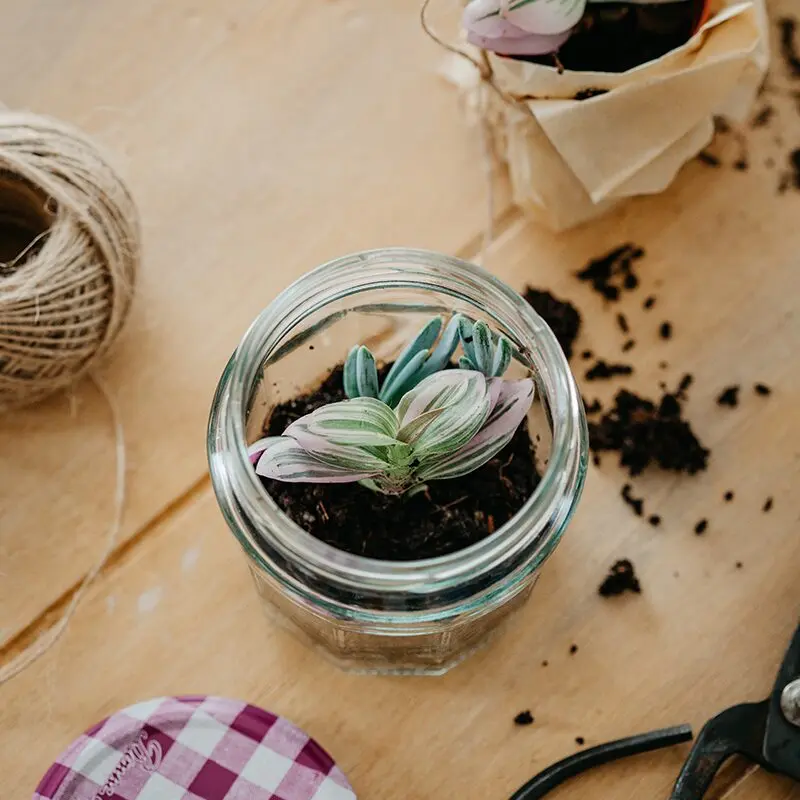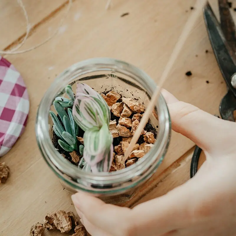 9. 最後にジュート紐でラベル看板を固定し、テラリウムを完成させます。
