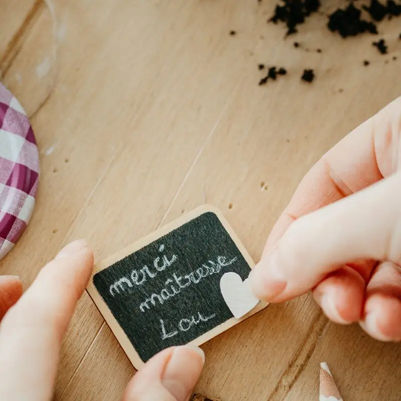 6. 白色鉛筆でラベルホルダーにメッセージを書きます。