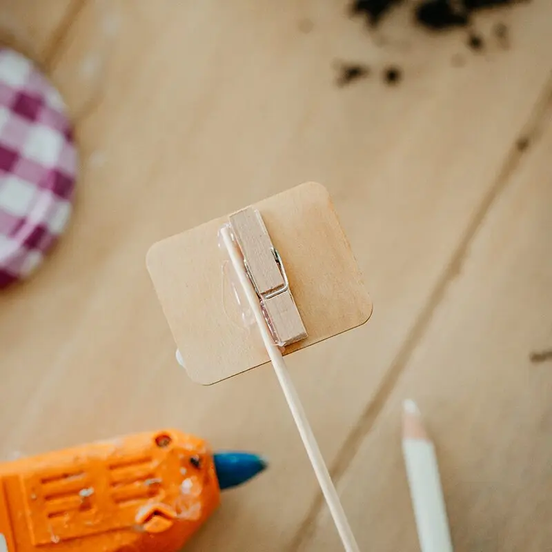 7. 木製スティック(串タイプ)の先にグルーガンでラベルホルダーを貼り付け、小さな看板として仕上げます。