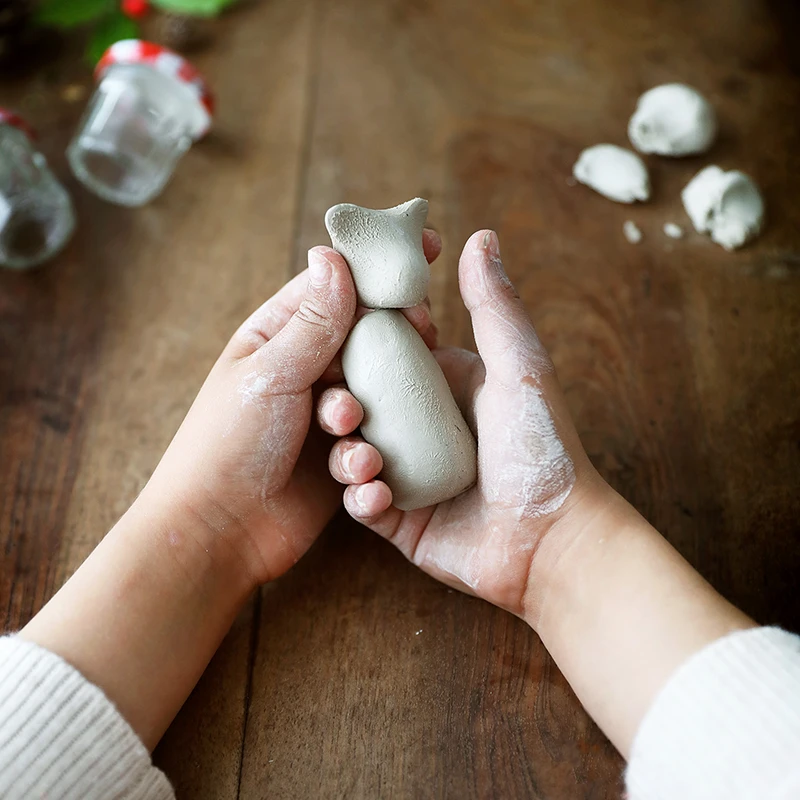 粘土で動物の形を作る。形はシンプルでOK。たとえば、体は楕円形(テーブルの上で平らになるように)、頭は少し丸みのある三角形に。そのあと耳の部分をつまんで作り、頭と体をくっつける