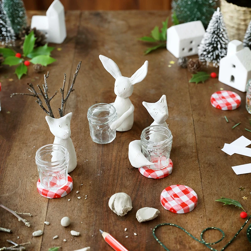 足やしっぽなどの細かい部分を作って、動物がジャム瓶を抱えるようにくっつける(例:キツネはしっぽで、うさぎは前足で瓶を持つように)