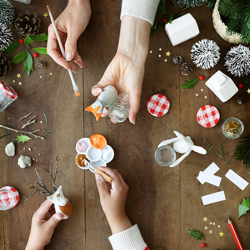 ボンヌママンの小瓶をクリスマスらしく飾る。ヒイラギやモミの枝などで小さなブーケを作り、星やオーナメントを添える