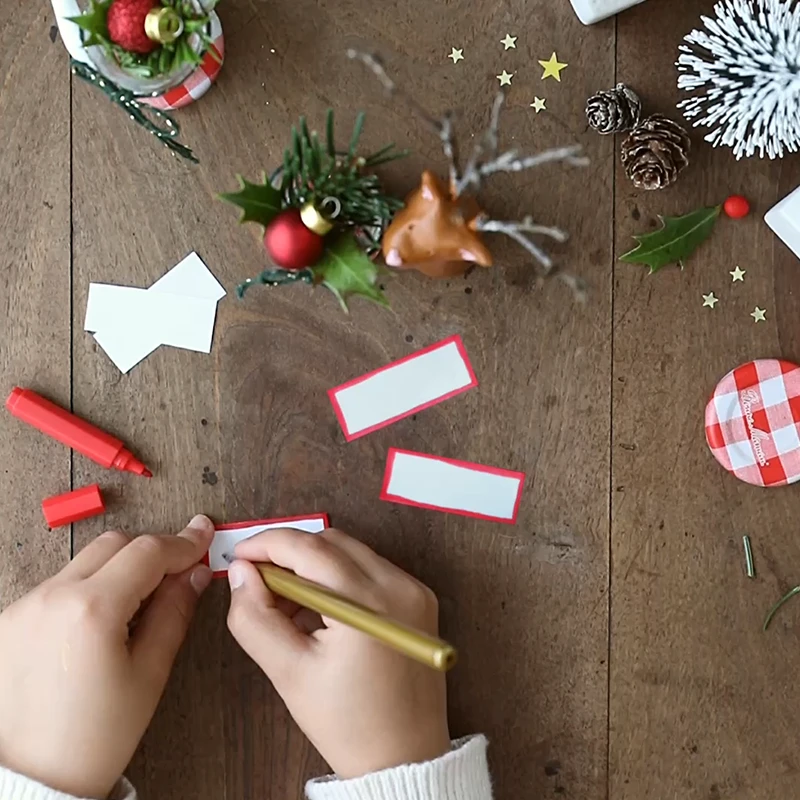 小さな紙(またはシールラベル)にペンで赤いフレームを描き、ゲストの名前を金色のペンで書く。そのラベルをボンヌママンの瓶に貼り、テーブルに並べれば完成!