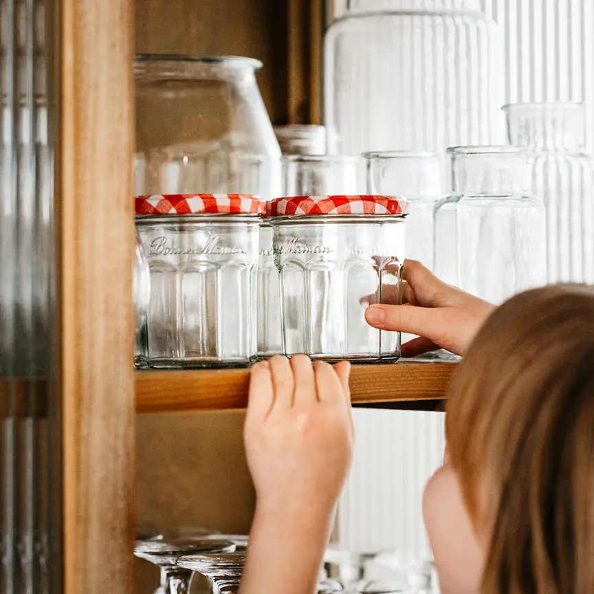 母の日ギフト用に、Bonne Maman の空き瓶をきれいに洗って乾かして準備します。