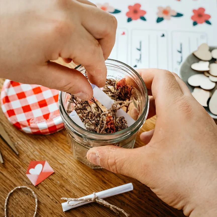 瓶の蓋を閉め、印刷した飾りパーツ(花、ハート、愛のメッセージなど)を貼ってデコレーションします。タグシールは、お好きな言葉を書くスペースとして使えます。
