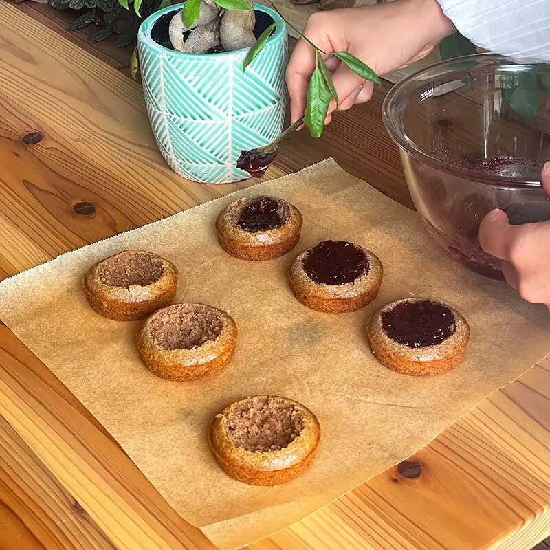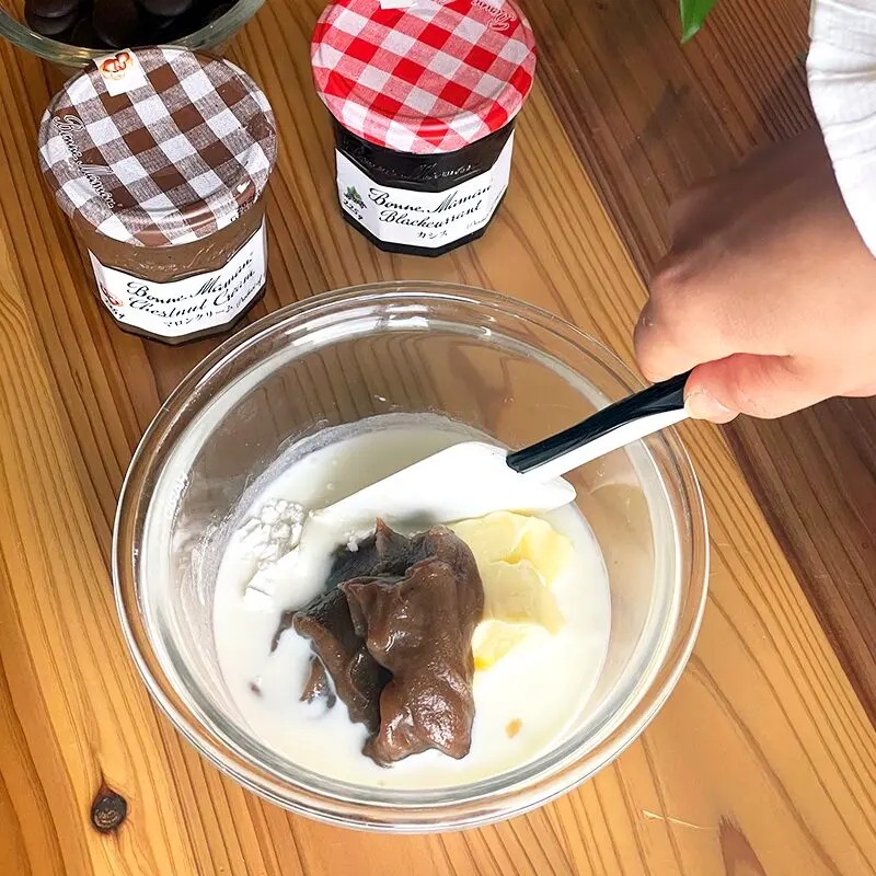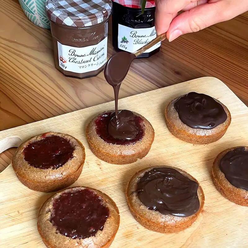 フィリング用のバターとコーンスターチを温め、スターチが溶けたら火から下ろし、ジャムを混ぜる。冷蔵庫で5分冷やし、ゼリー状にする。