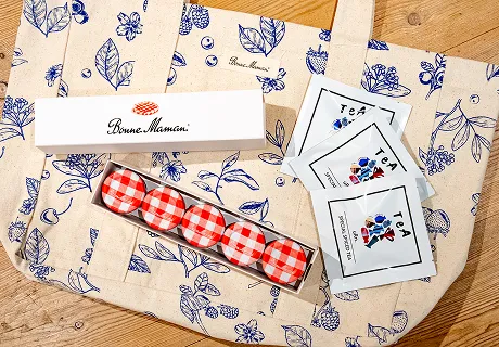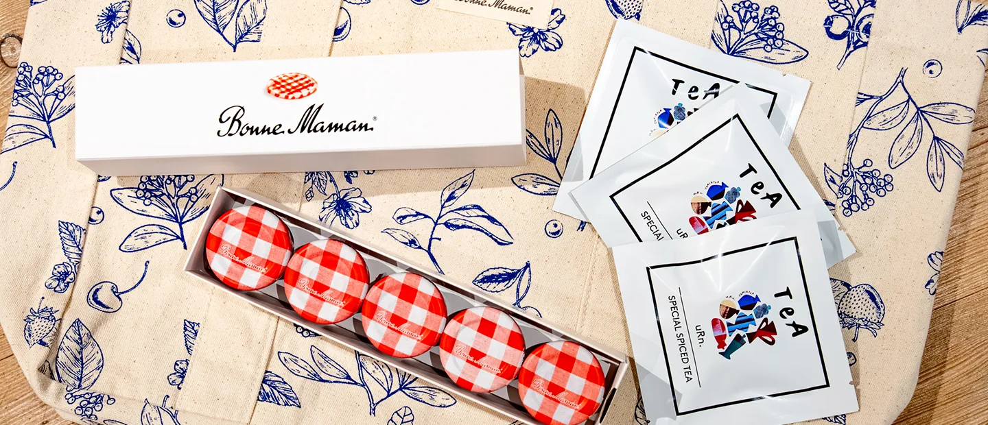 期間中に応募された応募者の中から抽選で5名様に、両社が別途指定した条件および方法で、「 Bonne Maman ミニジャムセット(ミニジャム30g×5個)、Bonne Mamanオリジナルトートバッグ、uRn.chAi&TeA ブレンドティーuRn. 1包(ティーバッグ2杯分)」のセットをプレゼントします。
